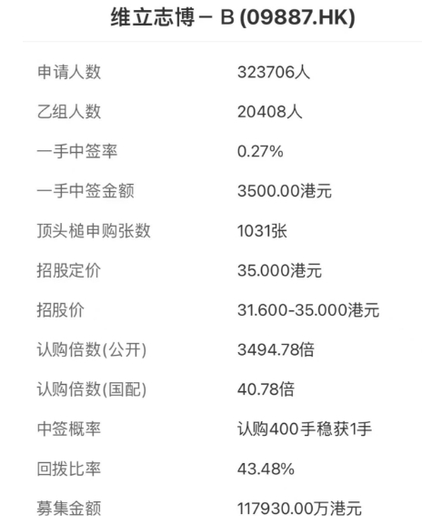 配售结果显示,申请人数是323706人,乙组20408人,顶头槌1031张,公开认购倍数是3494.78倍,国配认购倍数40.78倍,也是近三年国配认购倍数最高的新股,毫无疑问维立志博是散户和机构都疯狂抢购的热门新股,一手中签率仅0.27%。