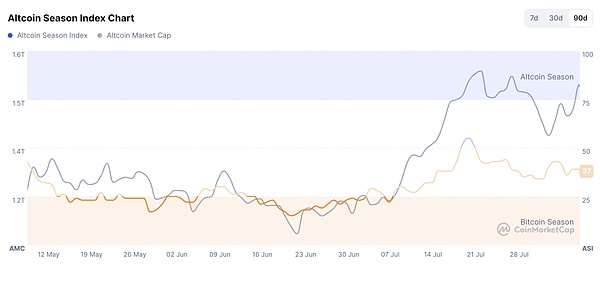 山寨季到来指数:截至7月31日,当前山寨季到来指数为24,相较于5月上旬的37,继续上升,这意味着当前山寨币机会在逐步增加。