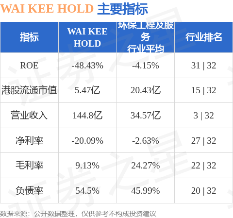 WAI KEE HOLD港股市值5.47億港元,在環保工程及服務行業中排名第15。主要指標見下表: