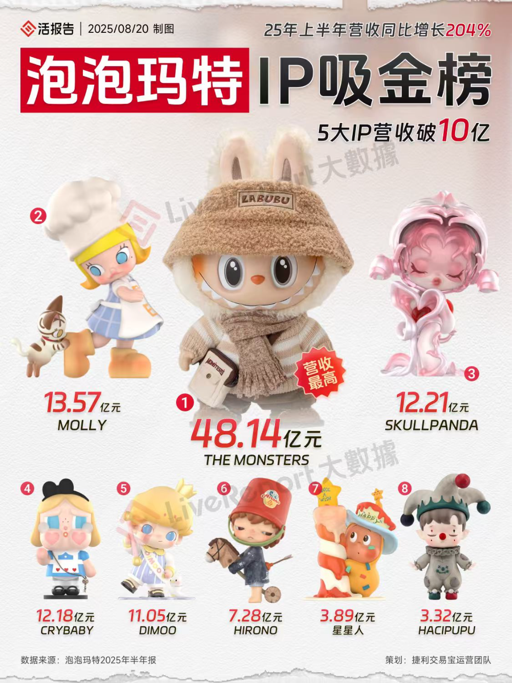 2025年上半年,泡泡瑪特營收138.76億元,同比增長204%,歸母淨利潤45.74億元,同比增長396%,營收、利潤均超過去年全年。其中,海外業務收入達56億元,同比增長超3倍,距離提出的「海外營收佔一半」的目標更進一步。