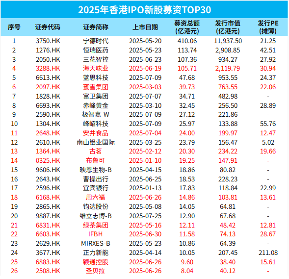 2 025 年 前 7個月,消費股 三大I PO 包括 海天味業 ( 106億港元,A+H )、 蜜雪集團 ( 40億港元 )、 安井食品 ( 24億港元,A+H ) 。 相比之下,2 024 年則為 華潤飲料 ( 58億港元 )、 毛戈平 ( 27億港元 )、 茶百道 ( 26億港元 )。