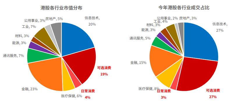 截至7月底, 港股市場 消費行業總市值超過10萬億港元,佔港股市值的約23%。其中可選消費約8.7萬億港元(19%),日常消費約1.6萬億港元(4%)。 消費行業成交額佔港股大市比重約30%,長期交易活躍,有大量市場投資者參與,與科技、金融和醫療保健行業共同構成了港股流動性集中地。