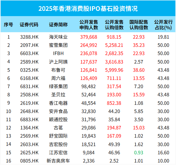 16只消費股香港IPO累計吸引超過160萬人次公開申購,其中11只獲百倍以上公開認購,7只獲十倍以上國配認購,散户與機構均全力搶籌。這表明,消費股在香港的市場認可度還在進一步提升。