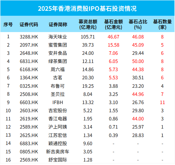 16只消費股香港IPO中,13只都有基石投資者參與認購,基石覆蓋率超八成。合計共71家基石投資了消費股,佔基石總家數的30.5%;總投資額達99.3億港元,佔其全球發售總額的35.1%。