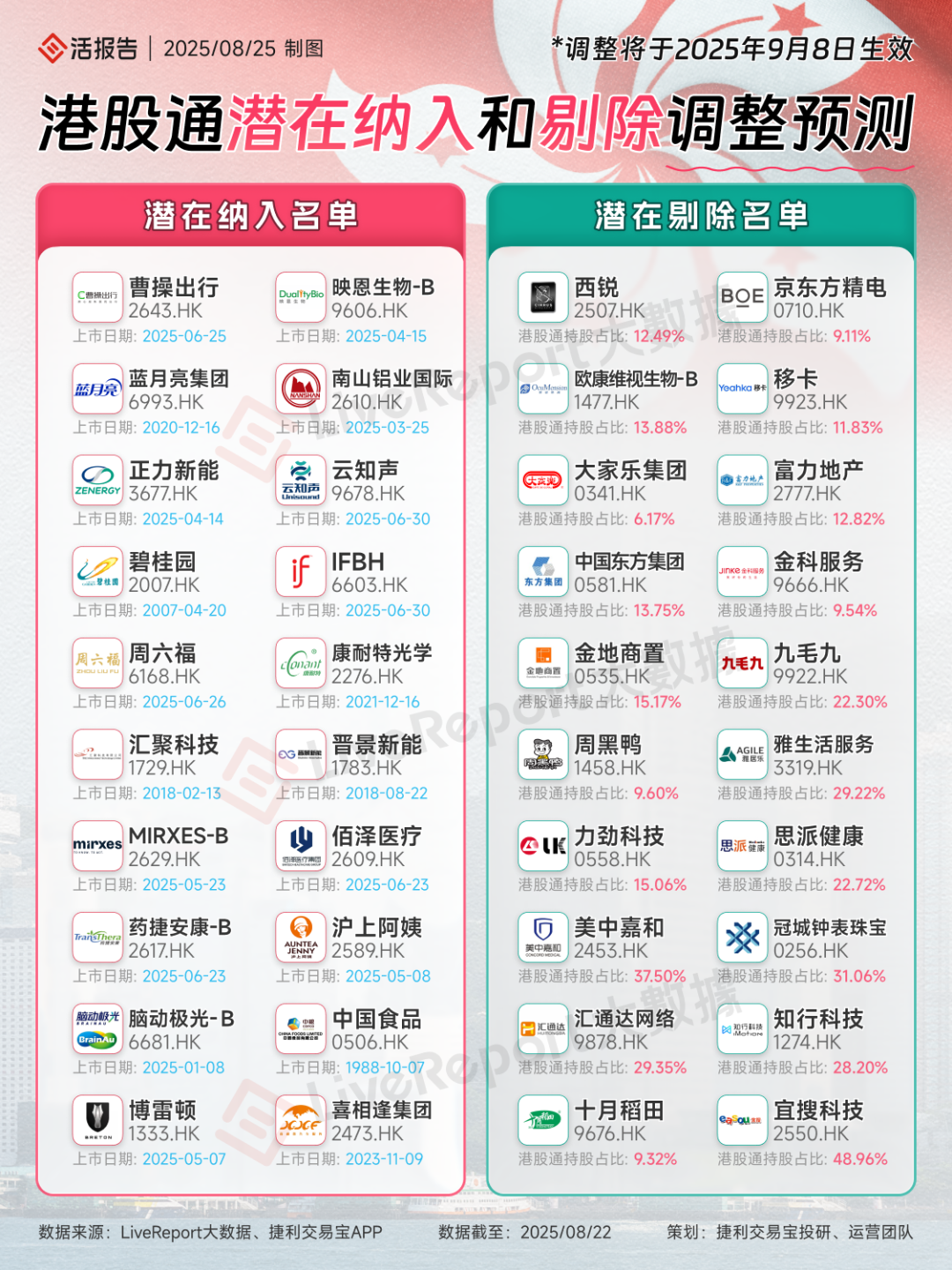 8月27日,博雷顿发布自愿性公告表示,公司已获恒生指数公司选定并纳入恒生综合指数成份股。据LiveReport大数据预测,博雷顿将被纳入港股通,相关调整预计于9月8日生效。