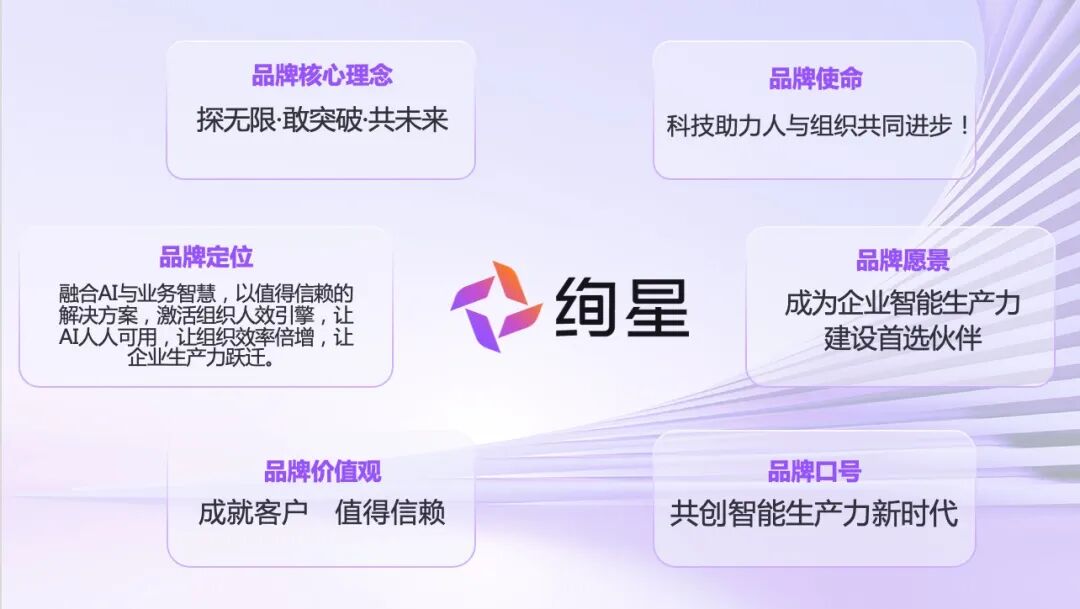圍繞這一價值理念,絢星品牌架構全面升級,宣佈全新品牌定位:融合AI與業務智慧,以值得信賴的解決方案激活人效引擎,讓AI人人可用,讓組織效率倍增,讓企業生產力躍遷。並進一步明確願景——成為企業智能生產力建設的首選夥伴,幫助企業構建既可落地、又可度量ROI的智能生產力。