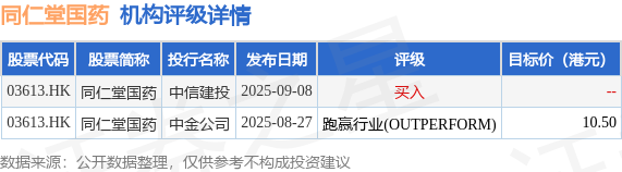 截至2025年9月26日收盤,同仁堂國藥(03613.HK)報收於8.81港元,下跌0.79%,成交量58.1萬股,成交額513.28萬港元。投行對該股的評級以跑贏行業(OUTPERFORM)為主,近90天內共有1家投行給出跑贏行業(OUTPERFORM)評級,近90天的目標均價為10.5港元。中信建投最新一份研報給予同仁堂國藥買入評級。