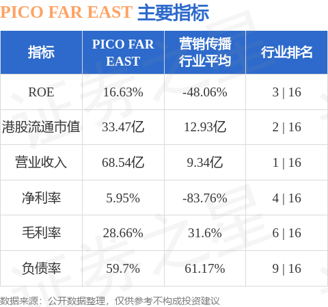 PICO FAR EAST港股市值33.47億港元,在營銷傳播行業中排名第2。主要指標見下表: