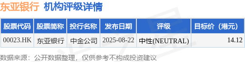 截至2025年10月13日收盤,東亞銀行(00023.HK)報收於12.59港元,下跌0.47%,成交量196.43萬股,成交額2446.33萬港元。投行對該股的評級以中性(NEUTRAL)為主,近90天內共有1家投行給出中性(NEUTRAL)評級,近90天的目標均價為14.12港元。中金公司最新一份研報給予東亞銀行中性(NEUTRAL)評級,目標價14.12港元。