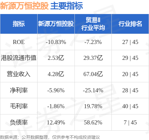 新源萬恆控股港股市值2.53億港元,在貿易Ⅱ行業中排名第29。主要指標見下表: