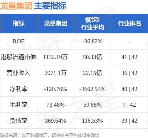 龍皇集團港股市值1132.19萬港元,在餐飲Ⅱ行業中排名第41。主要指標見下表: