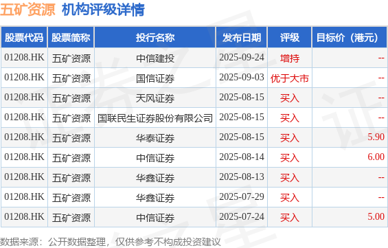 截至2025年10月21日收盤,五礦資源(01208.HK)報收於6.56港元,上漲1.08%,成交量5873.64萬股,成交額3.92億港元。投行對該股的評級以買入為主,近90天內共有7家投行給出買入評級,近90天的目標均價為5.63港元。中信建投最新一份研報給予五礦資源增持評級。