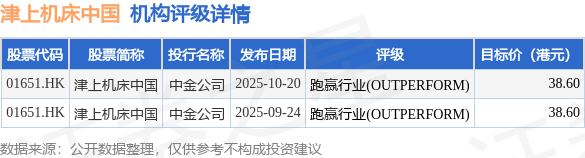 投行對該股的評級以跑贏行業(OUTPERFORM)為主,近90天內共有2家投行給出跑贏行業(OUTPERFORM)評級,近90天的目標均價為38.6港元。中金公司最新一份研報給予津上機牀中國跑贏行業(OUTPERFORM)評級,目標價38.6港元。