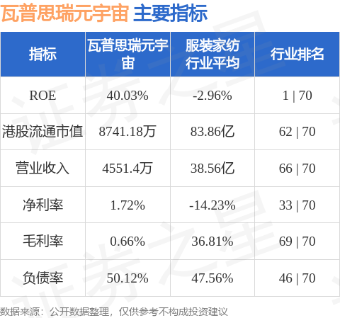 瓦普思瑞元宇宙港股市值8741.18萬港元,在服裝家紡行業中排名第62。主要指標見下表: