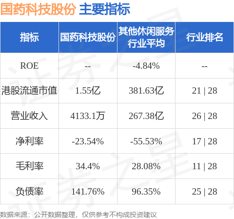 國藥科技股份港股市值1.55億港元,在其他休閒服務行業中排名第21。主要指標見下表: