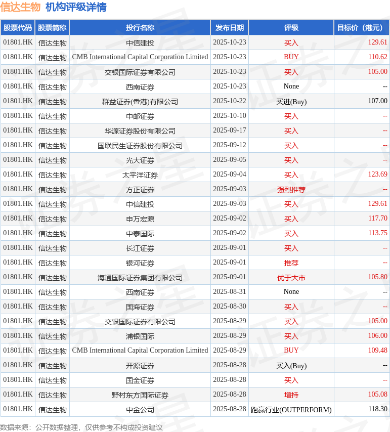 截至2025年10月24日收盤,信達生物(01801.HK)報收於85.55港元,上漲0.53%,成交量1542.87萬股,成交額13.27億港元。投行對該股的評級以買入為主,近90天內共有15家投行給出買入評級,近90天的目標均價為113.33港元。中信建投最新一份研報給予信達生物買入評級,目標價129.61港元。