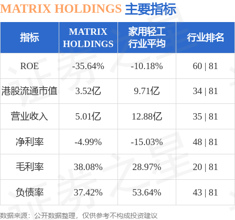 MATRIX HOLDINGS港股市值3.52億港元,在家用輕工行業中排名第34。主要指標見下表: