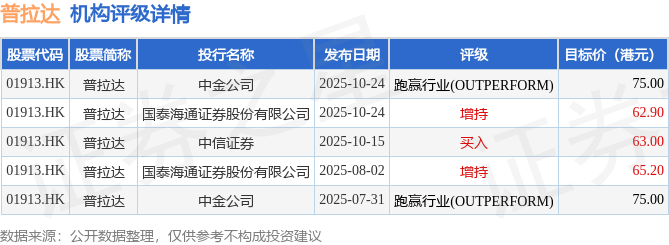 截至2025年10月27日收盤,普拉達(01913.HK)報收於50.25港元,上漲1.97%,成交量425.74萬股,成交額2.15億港元。投行對該股的評級以跑贏行業(OUTPERFORM)為主,近90天內共有2家投行給出跑贏行業(OUTPERFORM)評級,近90天的目標均價為68.22港元。中金公司最新一份研報給予普拉達跑贏行業(OUTPERFORM)評級,目標價75港元。