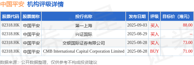 截至2025年10月30日收盤,中國平安(02318.HK)報收於57.1港元,上漲1.69%,成交量9461.55萬股,成交額54.68億港元。投行對該股的評級以買入為主,近90天內共有3家投行給出買入評級,近90天的目標均價為77.33港元。第一上海最新一份研報給予中國平安買入評級,目標價88港元。