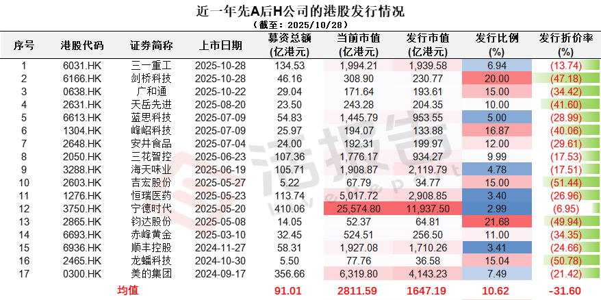 截至2025年10月28日,近一年成功赴港上市的A股公司合計17家,平均發行折價率約為31.60%。