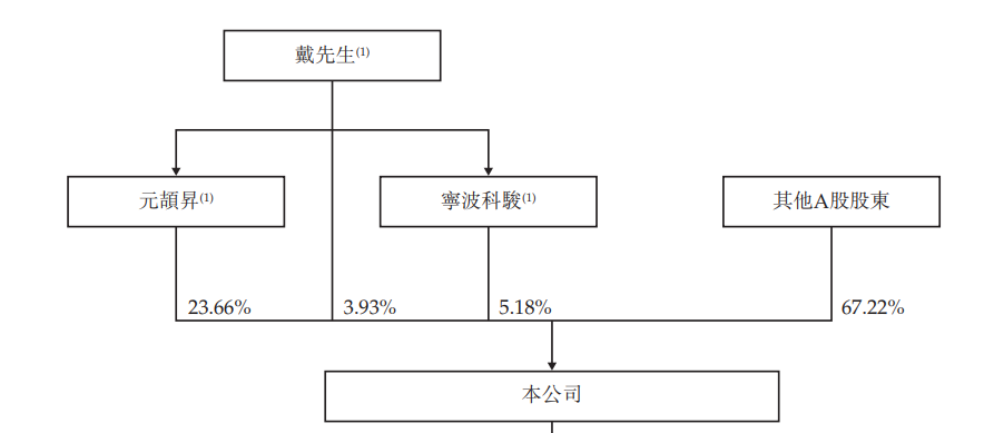 截至最后實際可行日期,公司分別由元頡升、寧波科駿及戴先生擁有約23.66%、5.18%及3.93%的權益。元頡升由戴先生擁有約55.48%的權益。戴先生擔任寧波科駿的普通合夥人。因此,於截至最后實際可行日期,戴先生、元頡升及寧波科駿(作為一組股東)合共於公司已發行股本總額中擁有約32.78%的權益。
