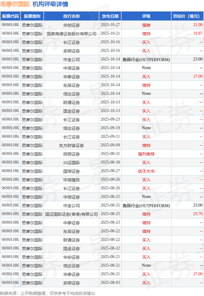 截至2025年10月31日收盤,思摩爾國際(06969.HK)報收於13.09港元,下跌1.87%,成交量2544.27萬股,成交額3.31億港元。投行對該股的評級以買入為主,近90天內共有15家投行給出買入評級,近90天的目標均價為23.64港元。華創證券最新一份研報給予思摩爾國際強推評級,目標價21.9港元。