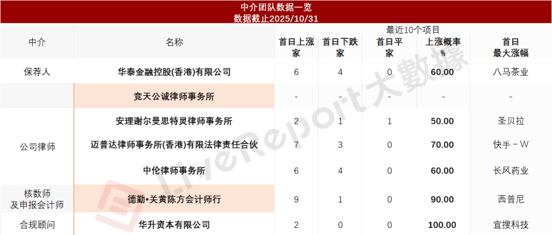 據LiveReport大數據統計,德鎂醫藥中介團隊共計7家,其中保薦人1家,近10家保薦項目數據表現不錯;公司律師共計3家,綜合項目數據表現良好。整體而言中介團隊歷史數據表現有一定優勢。