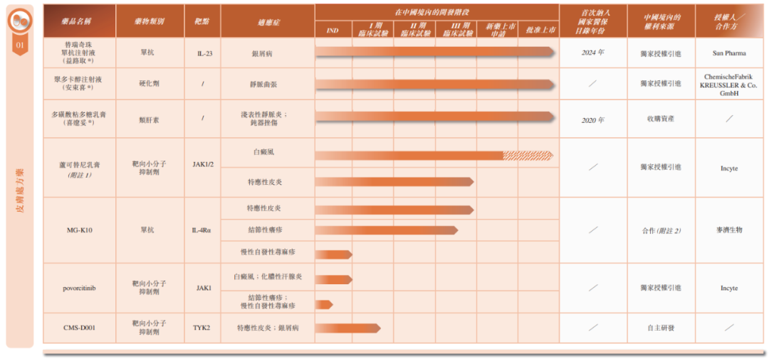 公司的主要產品包括(i)皮膚處方藥,及(ii)皮膚學級護膚品,其為主要由活性物質組成的化粧品,而其功效得到醫學證據支持。截至最后實際可行日期:(i)在皮膚處方藥領域,公司的主要產品管線包括三款已上市產品、四款處於臨牀階段或后期階段的候選產品及約五款臨牀前候選產品,覆蓋銀屑病、白癜風、特應性皮炎(AD)、皮膚挫傷、淺表性靜脈炎、靜脈曲張、化膿性汗腺炎(HS)、結節性癢疹(PN)、慢性自發性蕁麻疹(CSU)等主要皮膚疾病;及(ii)在皮膚學級護膚品領域,公司的代表性產品包括禾零舒緩系列產品與喜遼妥—壬二酸產品系列,該等護膚品主要針對患有特應性皮炎與尋常痤瘡的消費者。