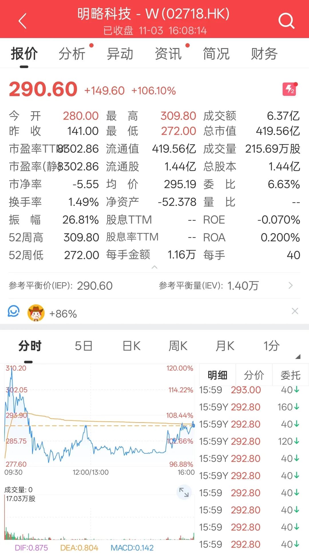上市首日,明略科技-W開盤,高開高走,一度漲至日內最高309.8港元,最高上漲119.72%,截至收盤報290.60港元,收漲106.10%,全天