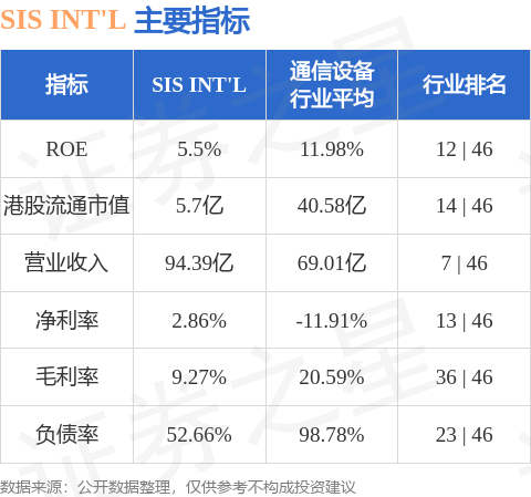 SIS INT'L港股市值5.7億港元,在通信設備行業中排名第14。主要指標見下表:
