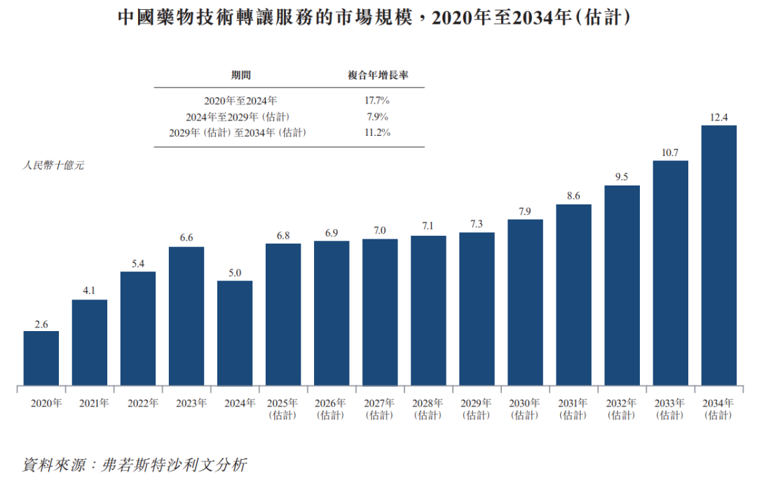 根據弗若斯特沙利文(Frost & Sullivan)的報告,中國藥物技術轉讓的市場規模從2020年的人民幣26億元增長至2024年的人民幣50億元,複合年增長率達17.7%。預計到2034年,該市場規模增長至人民幣124億元。