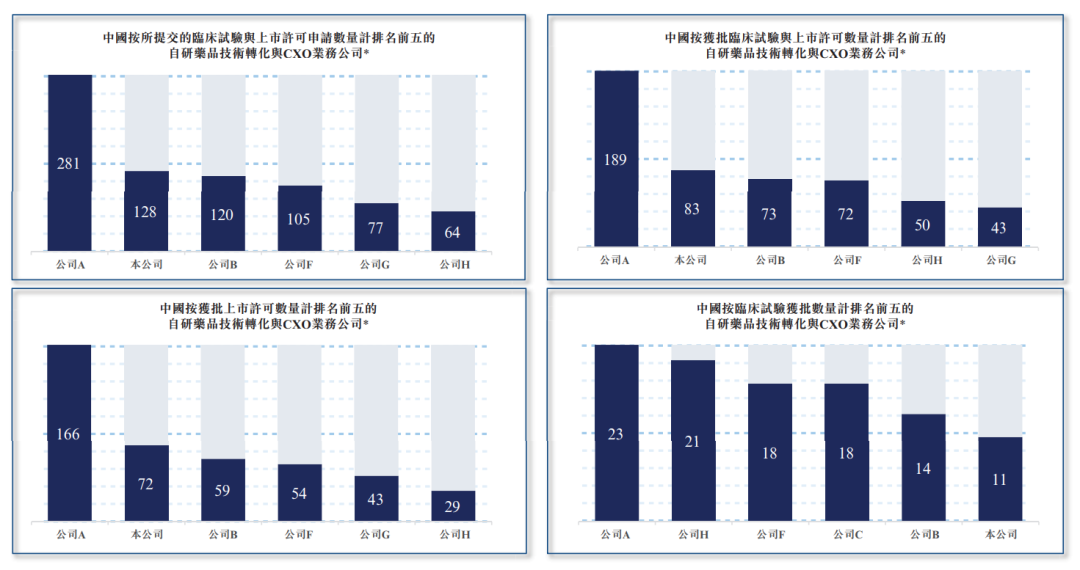 公司在中國按獲批臨牀試驗與上市許可數量計的自研藥品技術轉化與CXO業務公司中排名第二;
