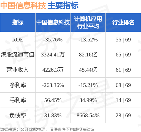中國信息科技港股市值3324.41萬港元,在計算機應用行業中排名第65。主要指標見下表: