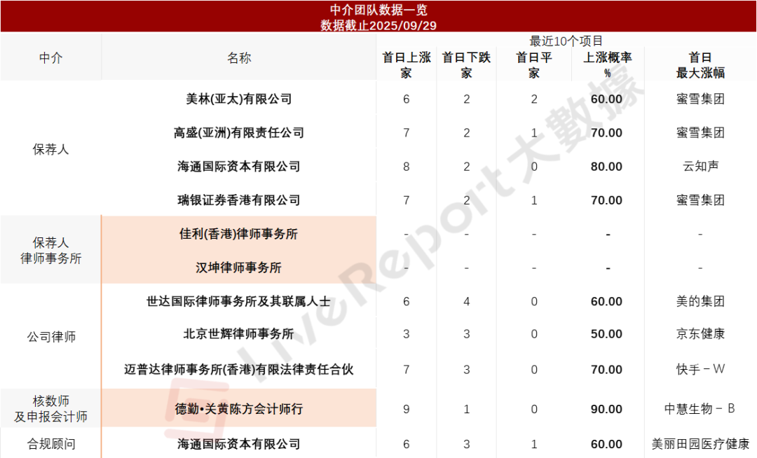 據LiveReport大數據統計,京東工業中介團隊共計11家,其中保薦人4家,近10家保薦項目數據表現令人印象深刻;公司律師共計3家,綜合項目數據表現良好。整體而言中介團隊歷史數據表現有一定優勢。