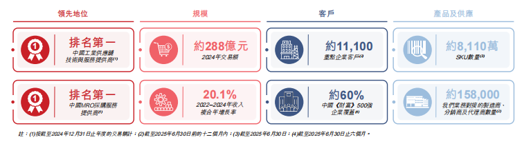 公司是中國領先的工業供應鏈技術與服務供應商,按2024年的交易額計,公司在中國MRO採購服務市場排名第一。公司在中國的工業供應鏈技術與服務市場擁有最廣泛的客户覆蓋,於2024年服務約11,100個重點企業客户。