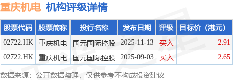 投行對該股的評級以買入為主,近90天內共有2家投行給出買入評級,近90天的目標均價為2.78港元。國元國際控股最新一份研報給予重慶機電買入評級,目標價2.91港元。