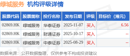 截至2025年11月27日收盤,綠城服務(02869.HK)報收於4.56港元,下跌1.08%,成交量283.62萬股,成交額1291.8萬港元。投行對該股的評級以買入為主,近90天內共有3家投行給出買入評級,近90天的目標均價為6.56港元。華泰證券最新一份研報給予綠城服務買入評級,目標價6.56港元。