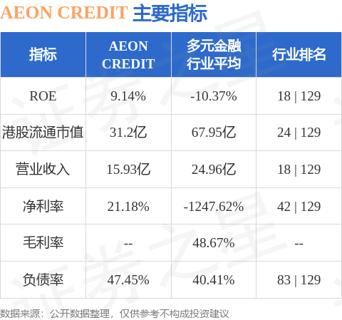 AEON CREDIT港股市值31.2億港元,在多元金融行業中排名第24。主要指標見下表:
