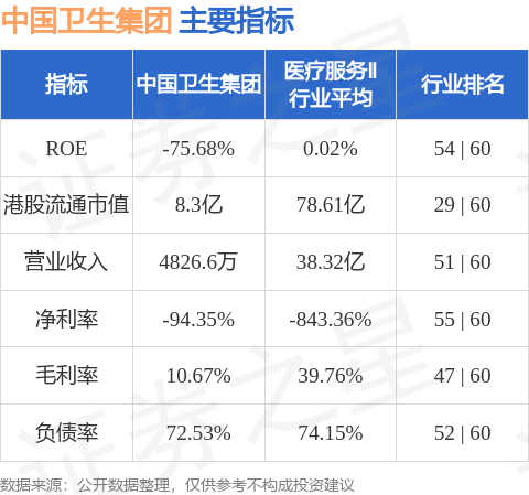 中國衞生集團港股市值8.3億港元,在醫療服務Ⅱ行業中排名第29。主要指標見下表: