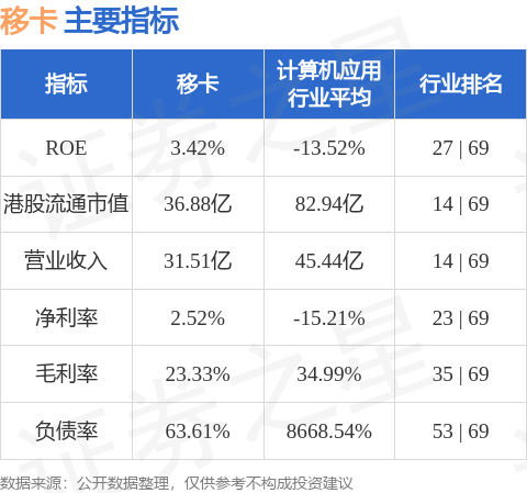 移卡港股市值36.88億港元,在計算機應用行業中排名第14。主要指標見下表: