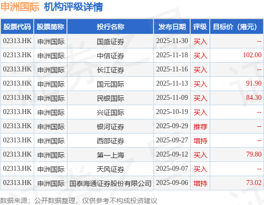 投行對該股的評級以買入為主,近90天內共有8家投行給出買入評級,近90天的目標均價為86.2港元。國盛證券最新一份研報給予申洲國際買入評級。
