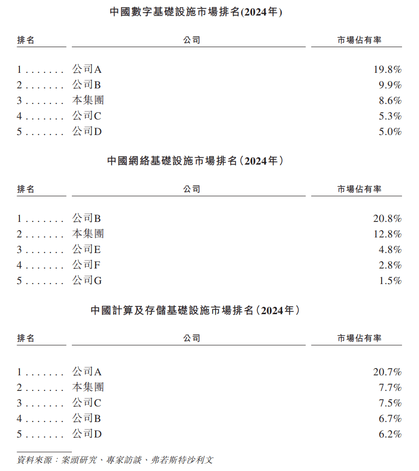根據弗若斯特沙利文的資料,按收入計,於2024年,公司為中國數字基礎設施市場的第三大供應商,市場份額為8.6%,公司在中國數字化解決方案市場排名第十。