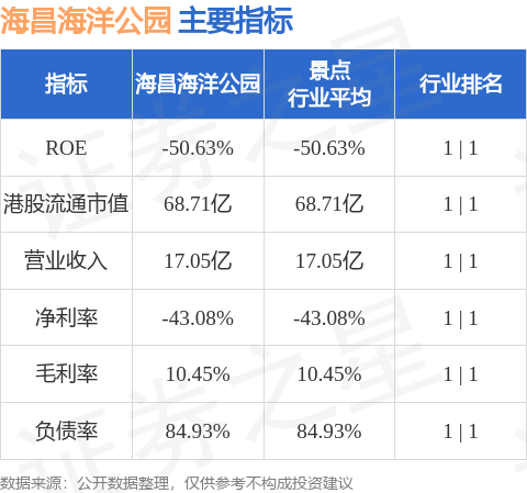 海昌海洋公園港股市值68.71億港元,在景點行業中排名第1。主要指標見下表: