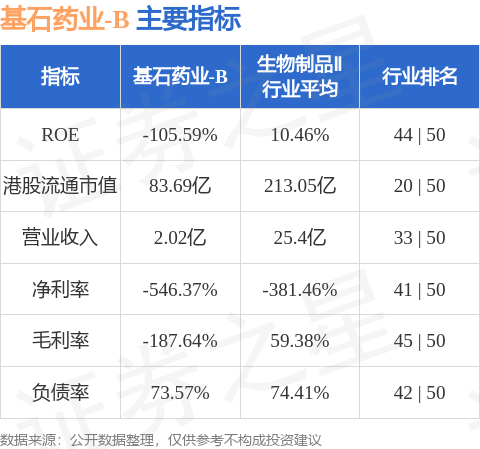 基石藥業-B港股市值83.69億港元,在生物製品Ⅱ行業中排名第20。主要指標見下表: