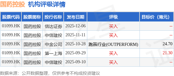 截至2025年12月9日收盤,國藥控股(01099.HK)報收於20.04港元,下跌1.57%,成交量354.57萬股,成交額7109.95萬港元。投行對該股的評級以買入為主,近90天內共有4家投行給出買入評級,近90天的目標均價為23港元。信達證券最新一份研報給予國藥控股買入評級。
