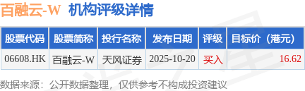 投行對該股的評級以買入為主,近90天內共有1家投行給出買入評級,近90天的目標均價為16.62港元。天風證券最新一份研報給予百融雲-W買入評級,目標價16.62港元。