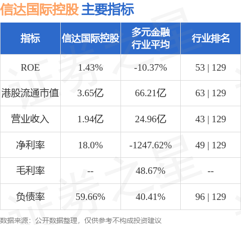 信達國際控股港股市值3.65億港元,在多元金融行業中排名第63。主要指標見下表: