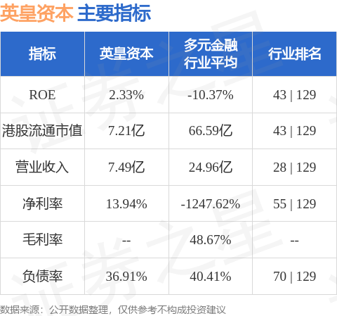 英皇資本港股市值7.21億港元,在多元金融行業中排名第43。主要指標見下表: