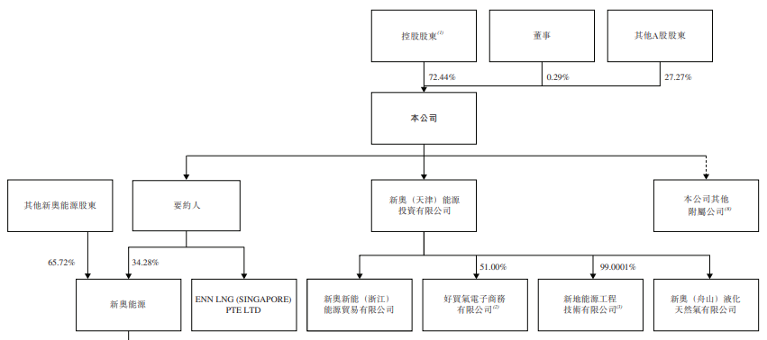 控股股東集團(王玉鎖先生、趙寶菊女士、新奧贏創、廊坊天然氣、新奧資本、新奧集團公司、新奧控股、新奧新智、新奧科技、新奧國際、廊坊合源及河北威遠)合計持股約72.44%,董事持股約為0.29%,其他A股股東持股約為27.27%。