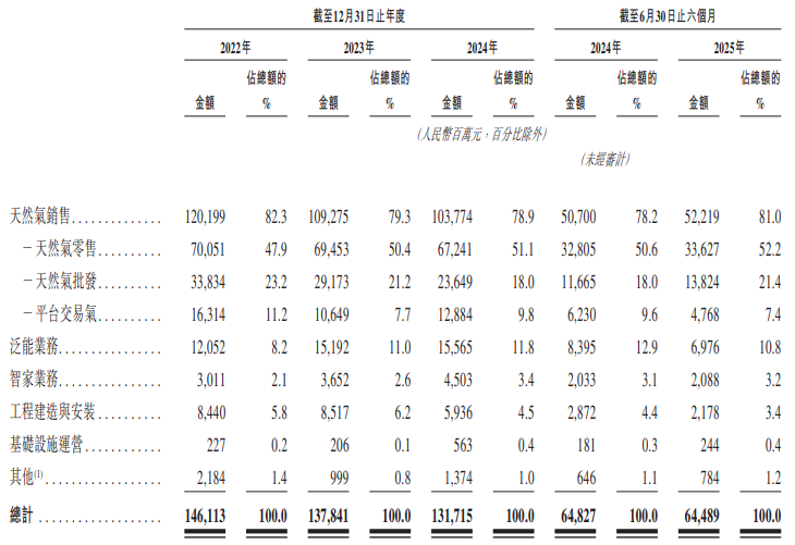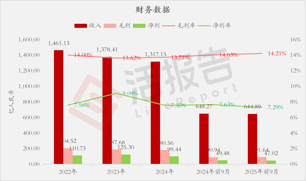 收入分別約為人民幣1461.13億、1378.41億、1317.15億、648.27億、644.89億,2025年前9月同比-0.52%;